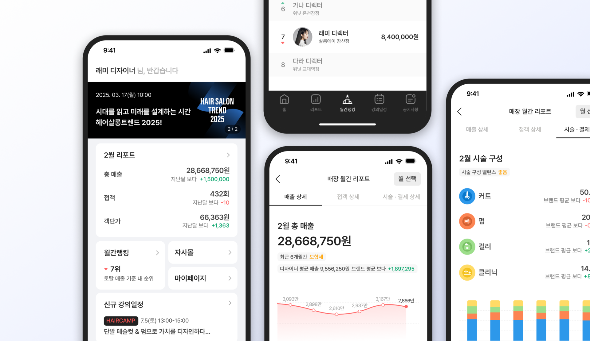 매장 및 디자이너의 모든 객관적인 데이터 분석과 도움이 되는 정보를 시스템과 앱을 통해 제공합니다. 어떤 것을 잘하고 무엇을 보완할 수 있는지 한 눈에 확인해보세요.